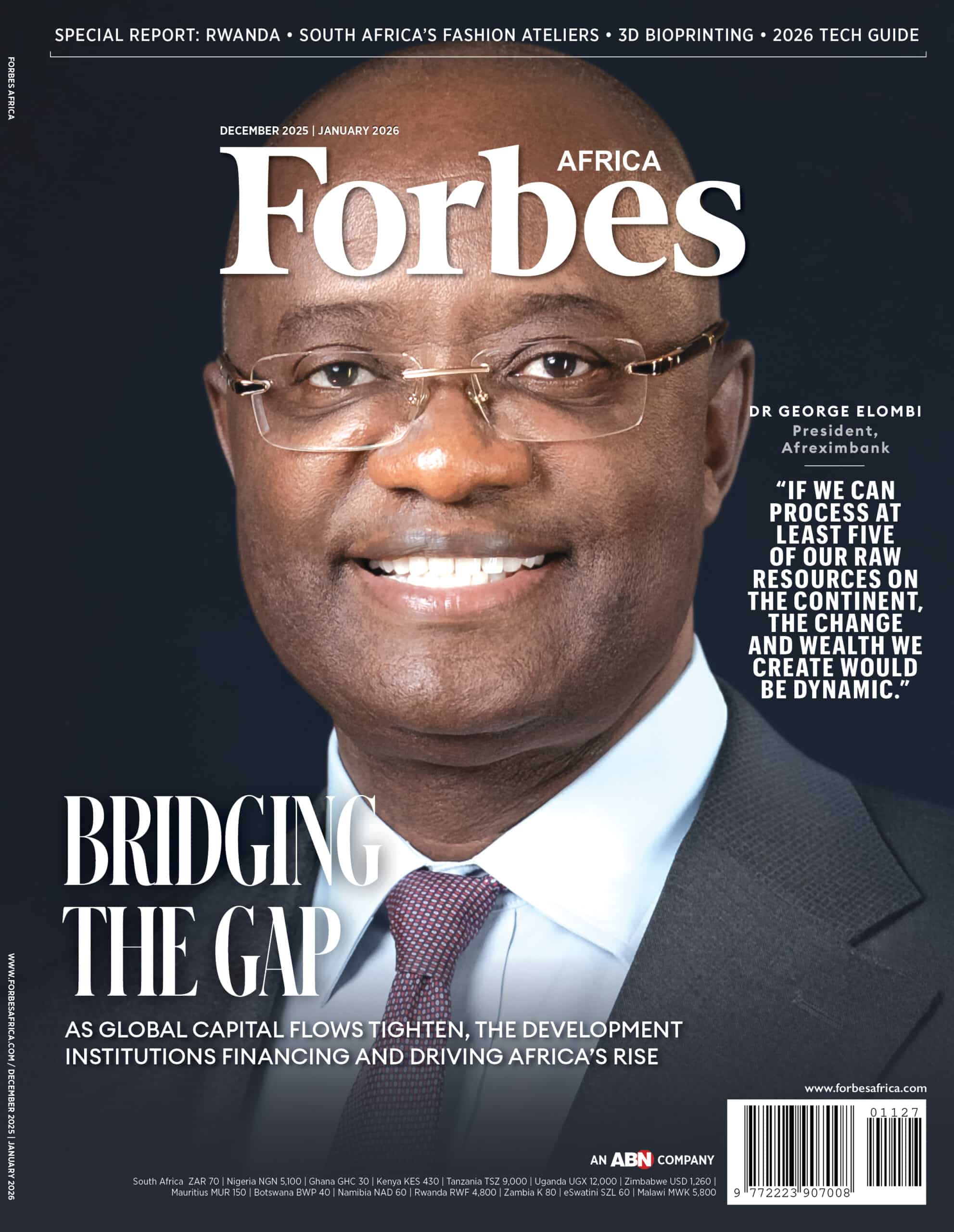 As global capital tightens, African multilateral development finance institutions (DFIs) are turning inward, mobilizing domestic savings, rethinking industrial policy, and building a new ecosystem of patient, locally-anchored capital. In the latest issue of FORBES AFRICA, we unpack the conversations happening across Africa’s financial capitals–with several DFI CEOs, Managing Directors and Presidents–on how to fund the continent’s next growth chapter without leaning too heavily on the world’s tightening purse strings. Dr George Elombi, Afreximbank’s recently-appointed President is ready to guide the Cairo-based multilateral lender through its next decade: a period he believes must define Africa’s industrial rebirth. He speaks on everything, from processing what Africa produces to the continent’s youth equation and the broader horizon ahead. Also in this issue, from pioneering mobile money adoption to streamlining public services, the tiny, hilly East African nation of Rwanda is taking technological transformation to newer heights. We also take a look the journey of an African fashion garment–from the rich textures found in rural homesteads to the catwalks of global fashion capitals, these garments carry stories of heritage, identity and innovation. We speak to three visionary designers that are redefining modern style—through textiles, silhouettes, and craft—by blending tradition with contemporary expression, and placing African fashion, firmly, on the world stage. Amongst the latest developments in the world of artificial intelligence (AI)–robotic companions and the formation of emotional bonds with AI. The rise in status of the SA20 cricket competition over the past few years is also in the spotlight, along with the G20, which recently took place, for the first time, on African soil, AGOA and the shifting power dynamics in global policy. All this and more in the December 2025/January 2026 issue of FORBES AFRICA. Get your copy today!